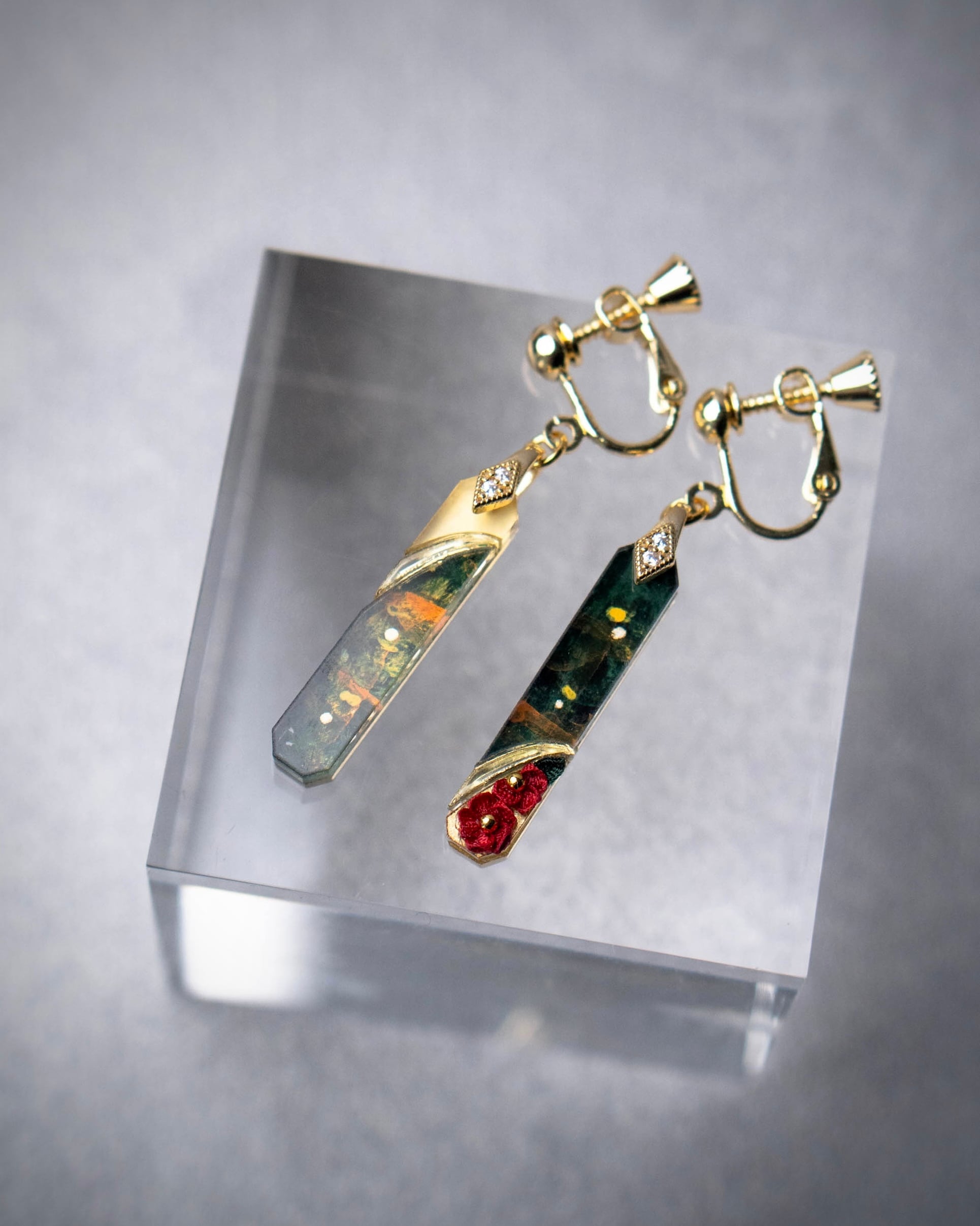 色の滲んだアクリルと日本の伝統技法つまみ細工の織りなすアクセサリーはまるで小さな芸術です。着飾ることのできるアートとして日々を彩ってくれます。