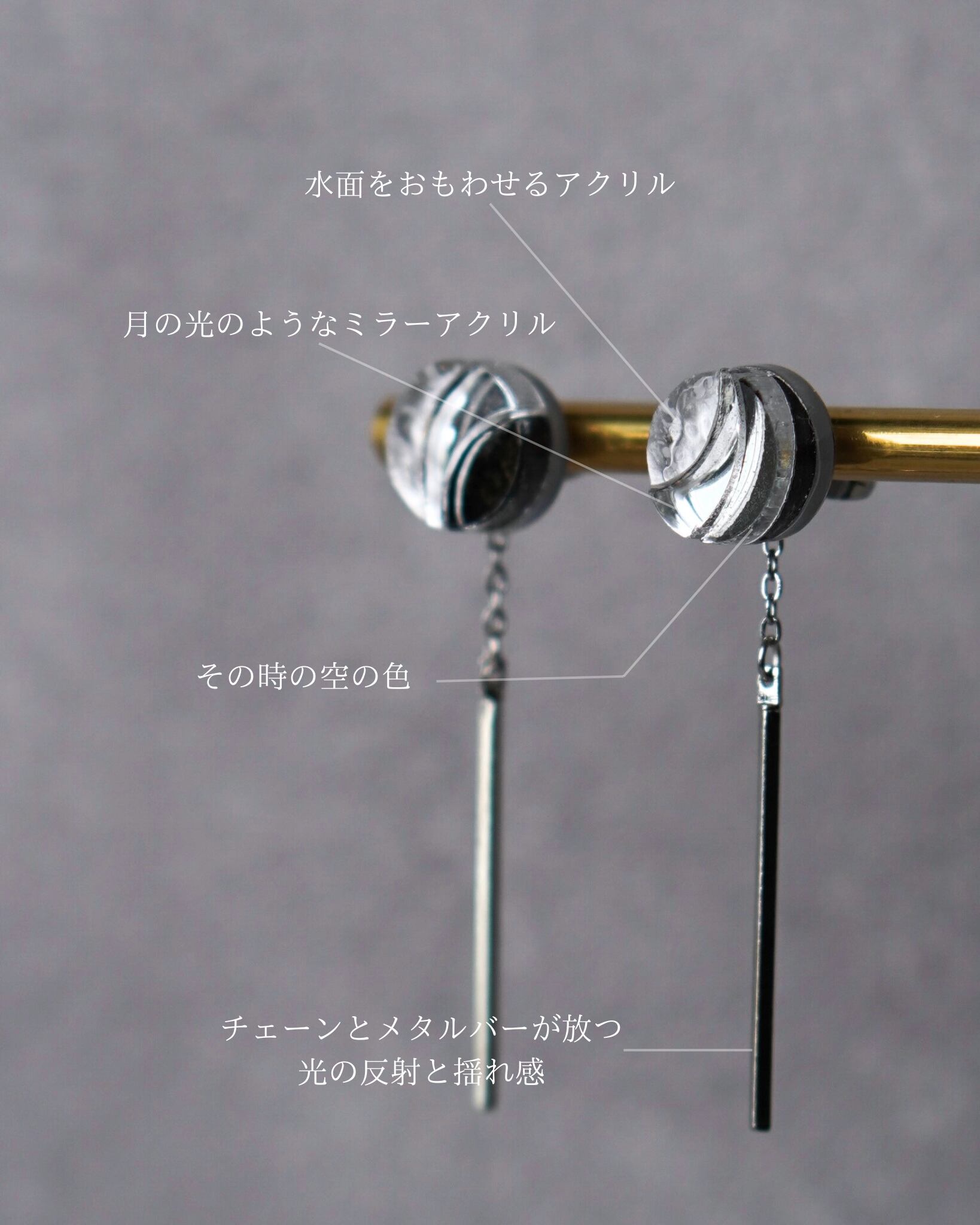 水面、月、空もしくは水たまりの色を想起させるアクリルを組み合わせました。