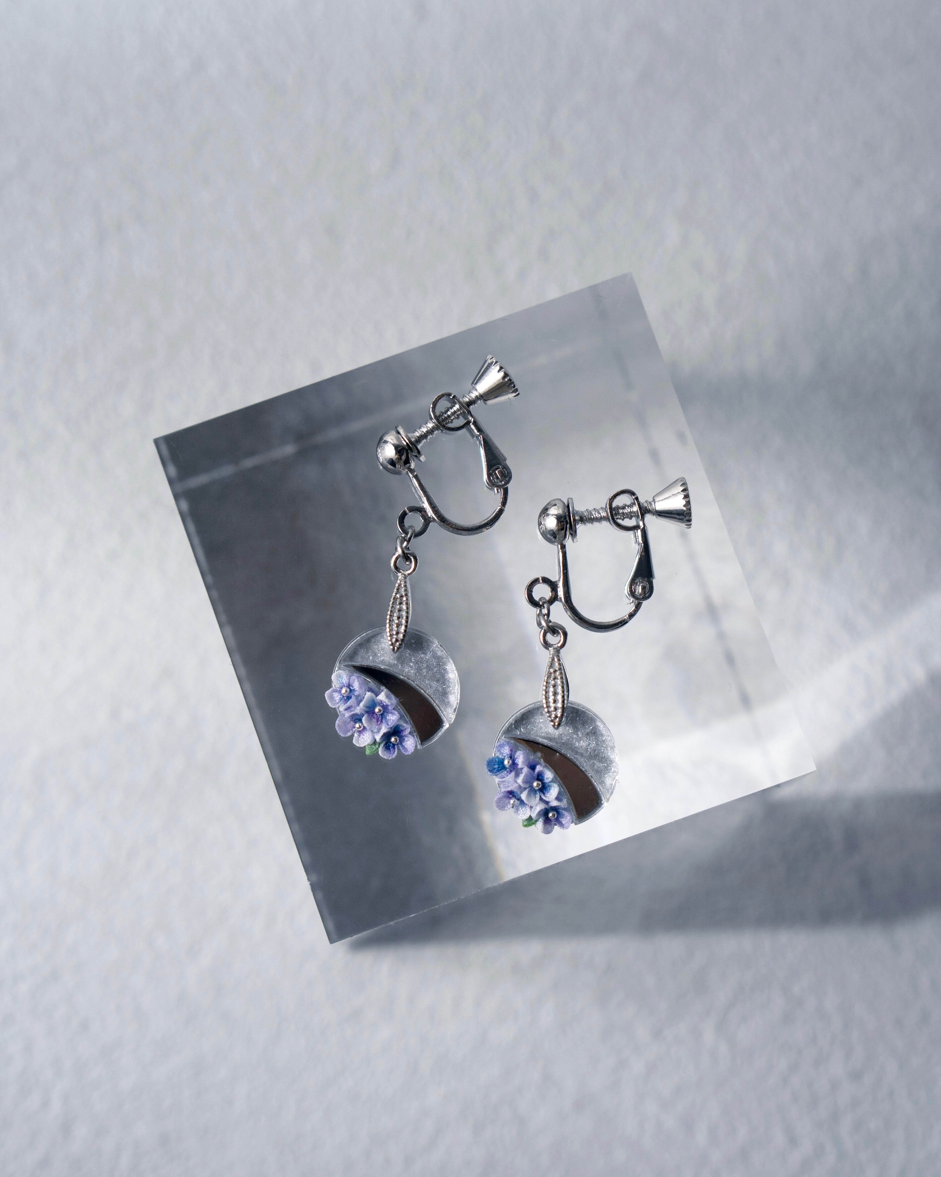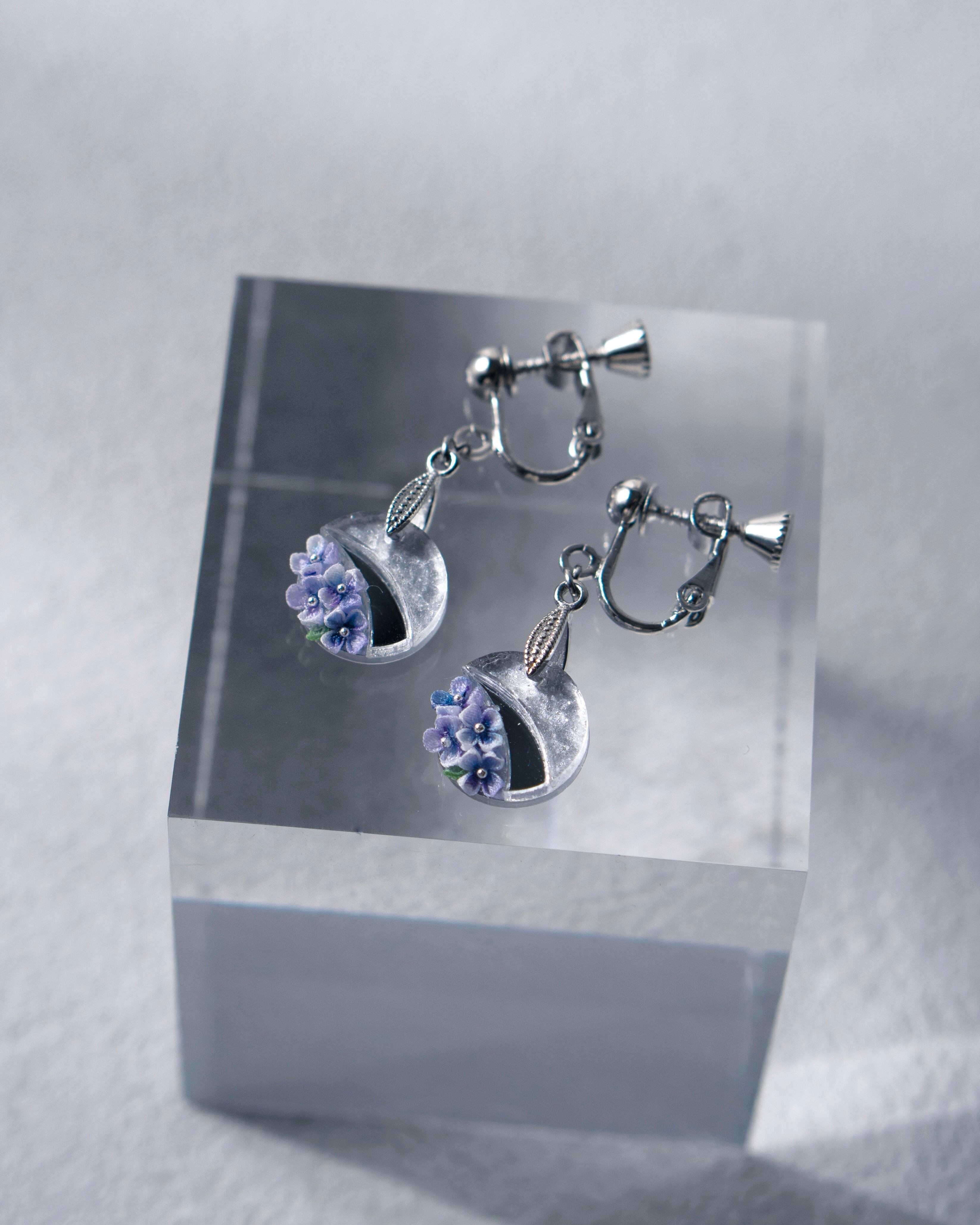 水を想起させる波を打つクリアなアクリル、つまみ細工で美しく咲く紫陽花を、そしてアクセントのミラーアクリルが組み合わさったアクセサリー。