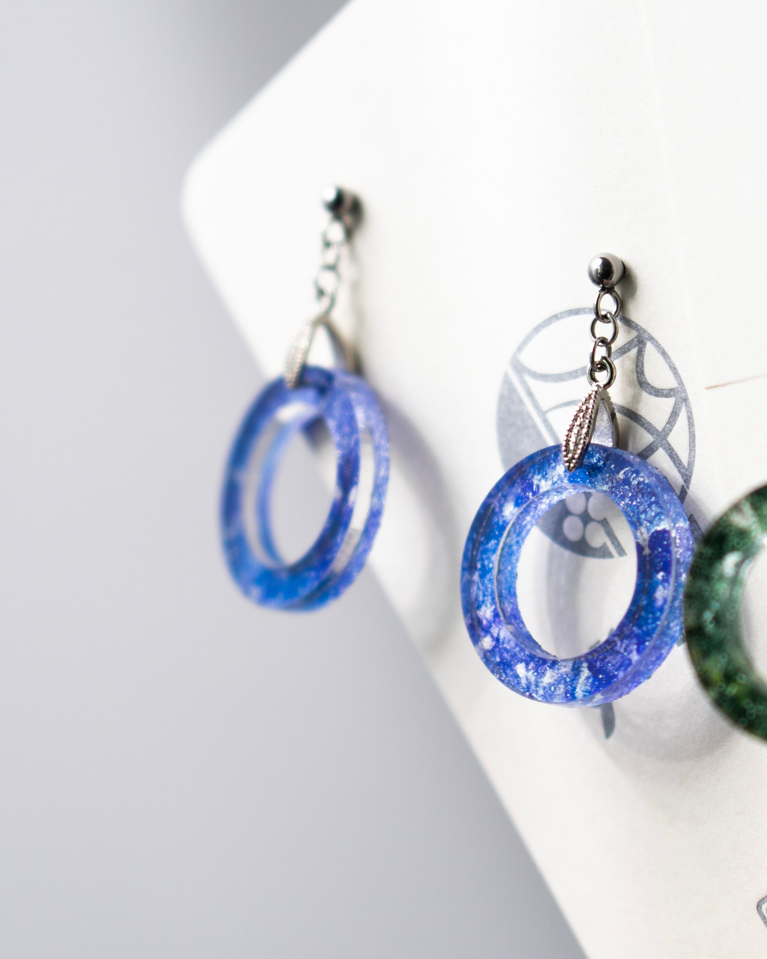 深い色の青や紫を基調とした大きな輪が揺れるデザイン。