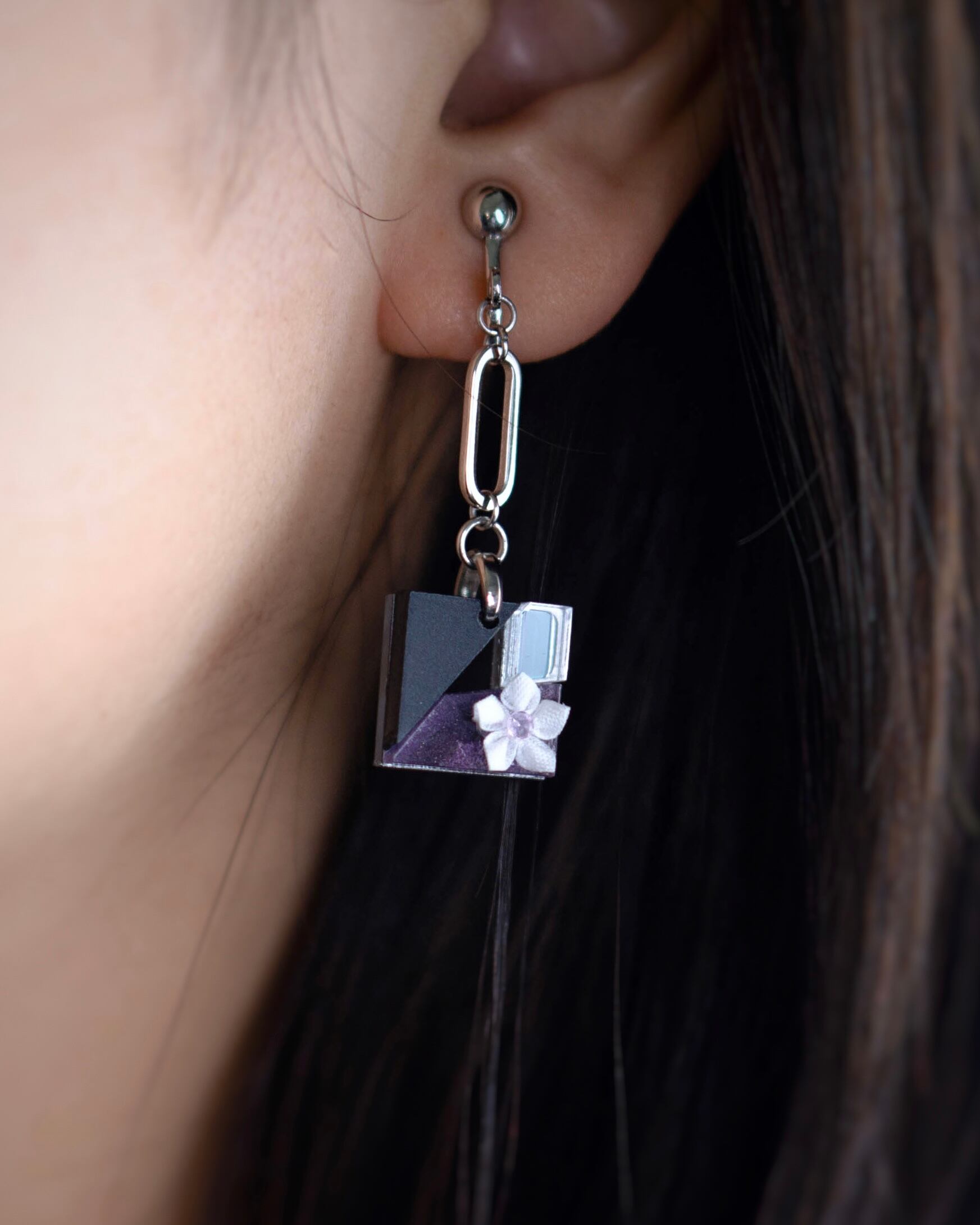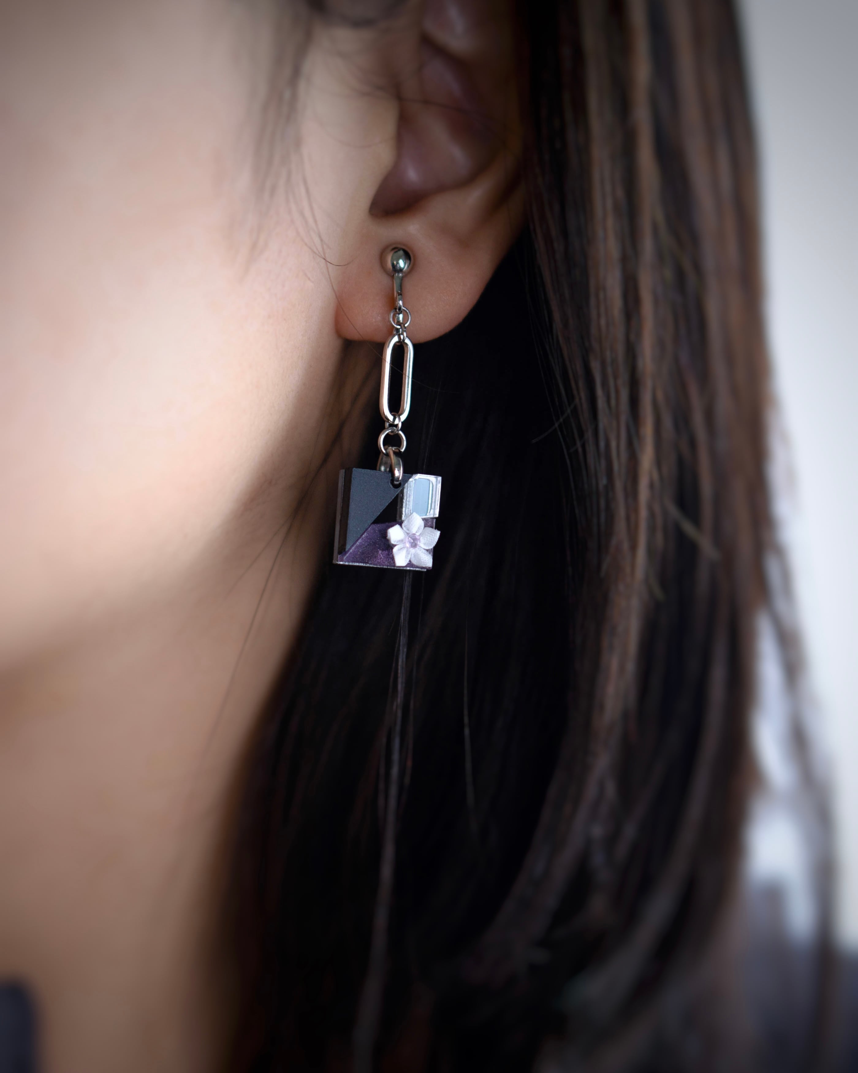 五枚花弁の花はクリスマスローズの花を、幾何学な形の中央は空洞になっており肌なじみが良いデザインとなっています。