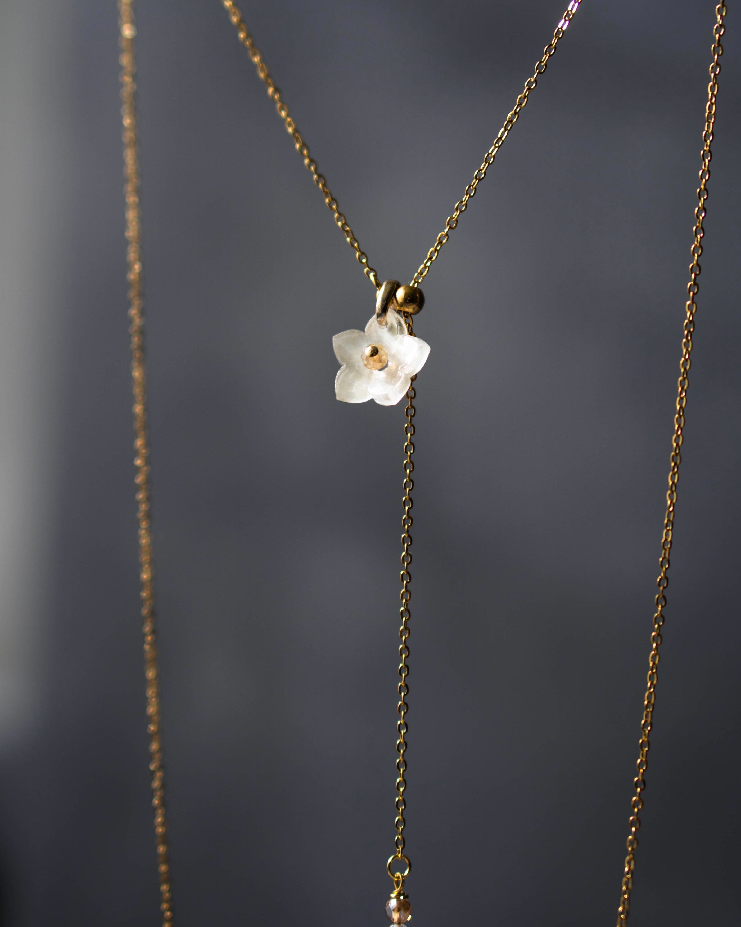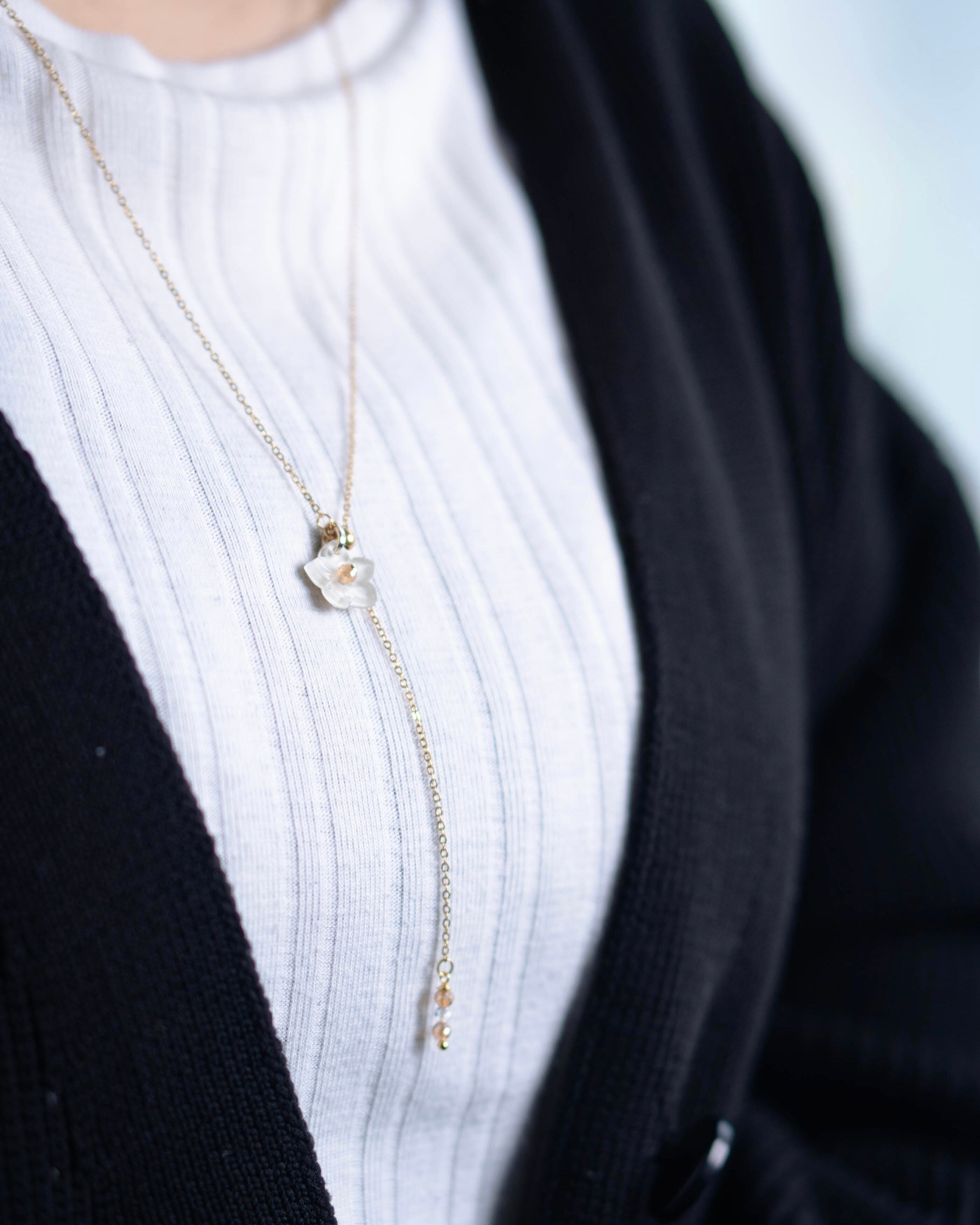 material:アクリル、サージカルステンレス、シャンパンカラークォーツ、クォーツ、真鍮、レジン(花の裏の補強)