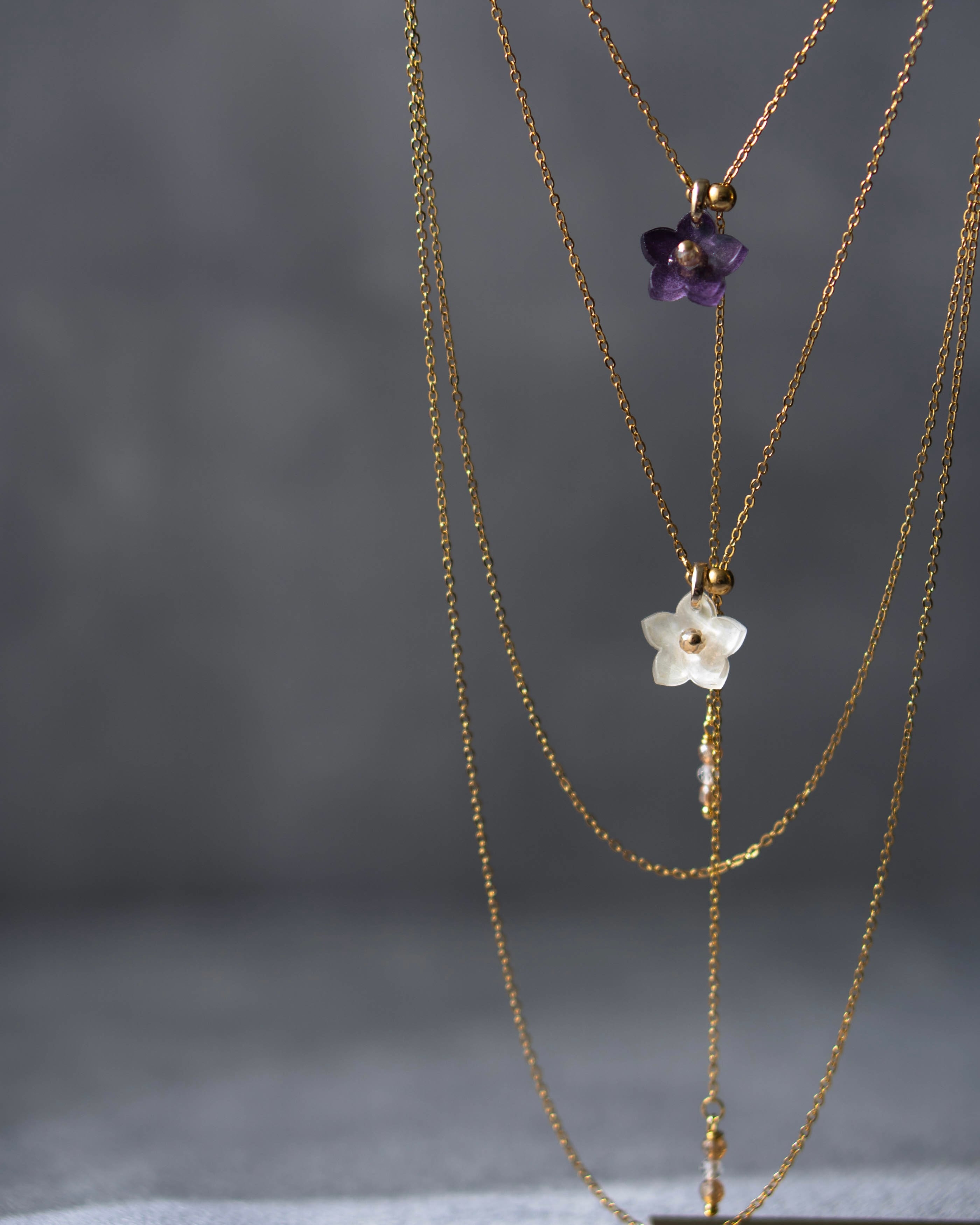 material:アクリル、サージカルステンレス、シャンパンカラークォーツ、クォーツ、真鍮、レジン(花の裏の補強)