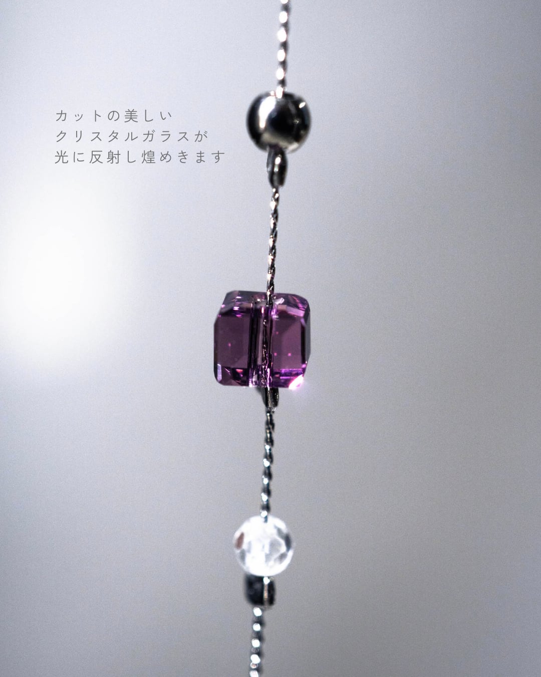 下には桜の色に合わせたクリスタルガラス、透明なクォーツをあしらったチェーンが軽やかに揺れます。