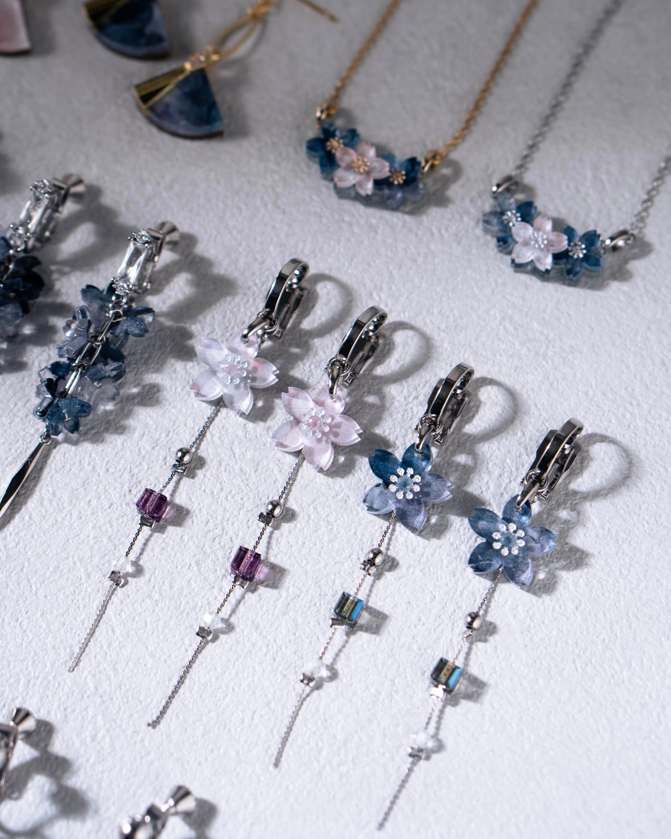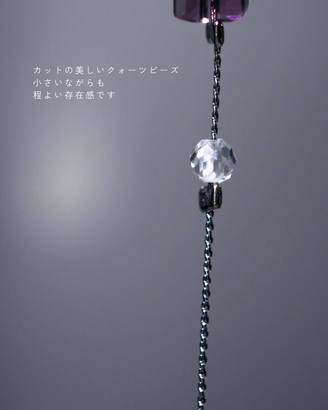 下には桜の色に合わせたクリスタルガラス、透明なクォーツをあしらったチェーンが軽やかに揺れます。