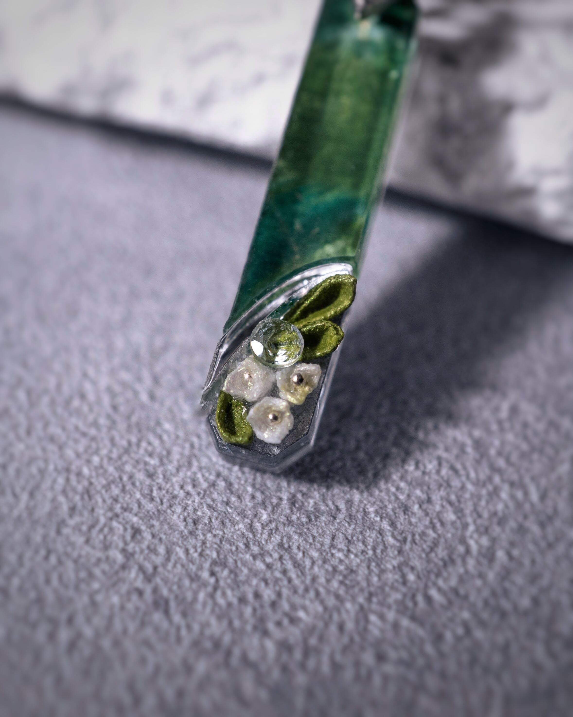 つまみ細工の花は鈴蘭をモチーフにひとつずつ咲かせました。