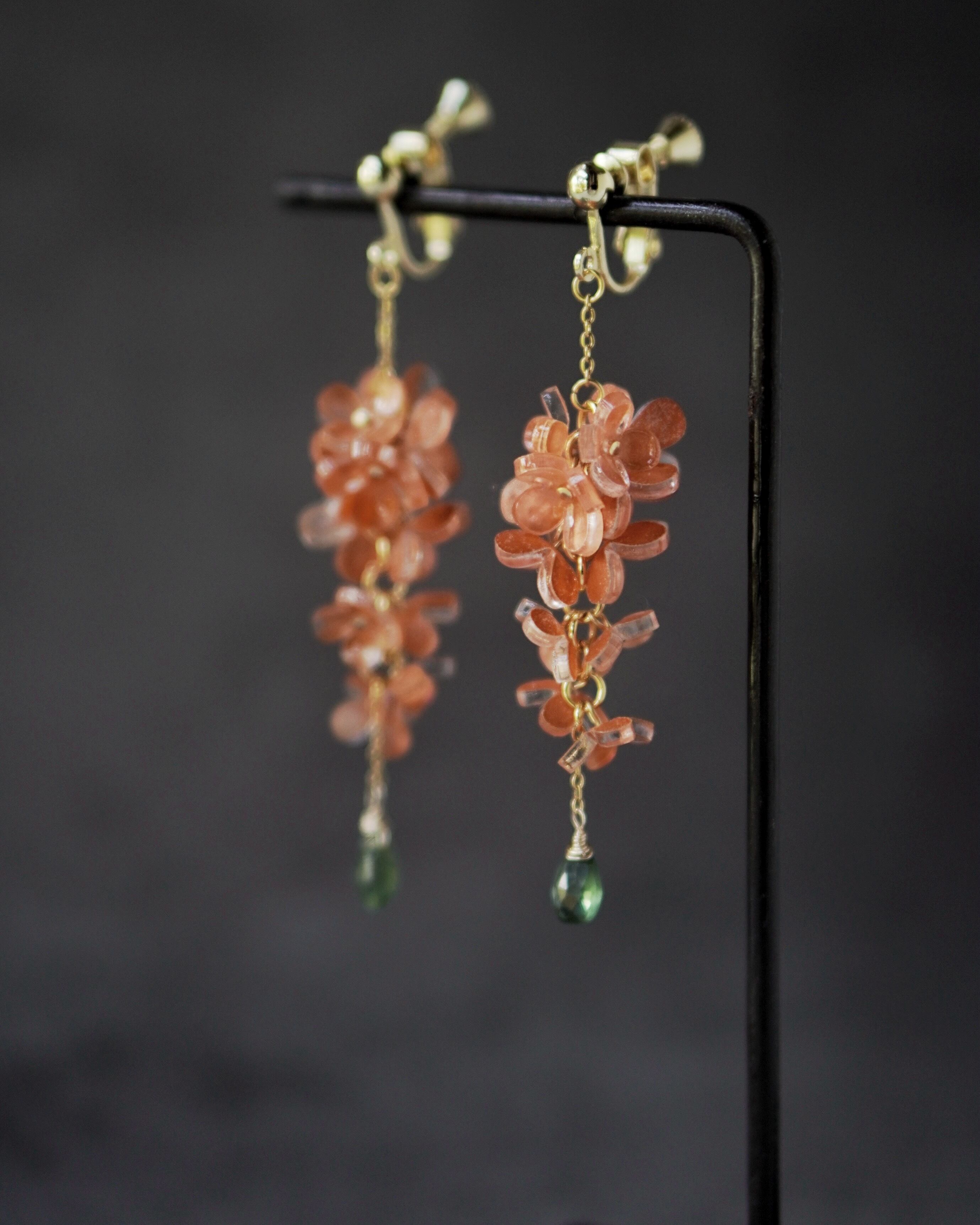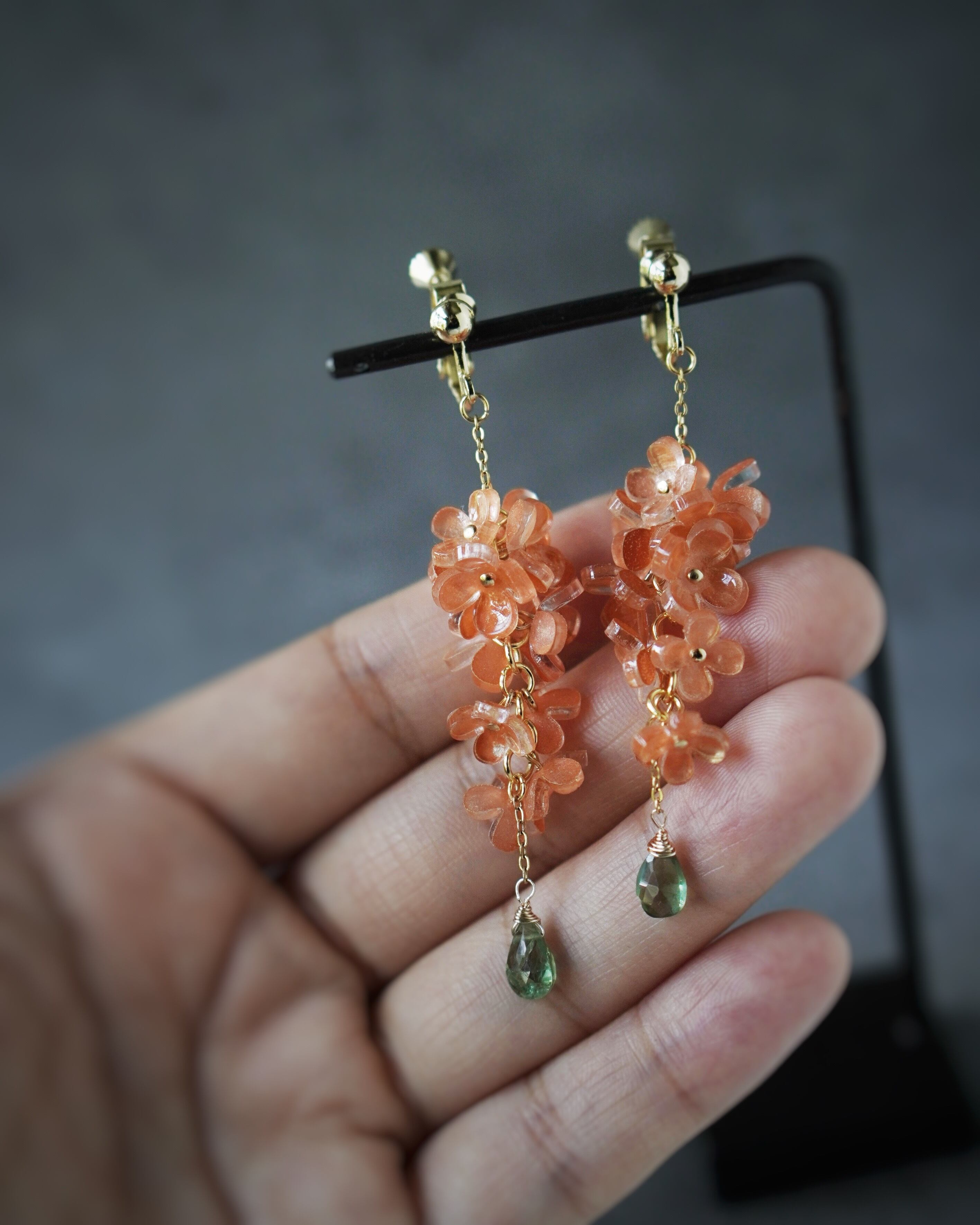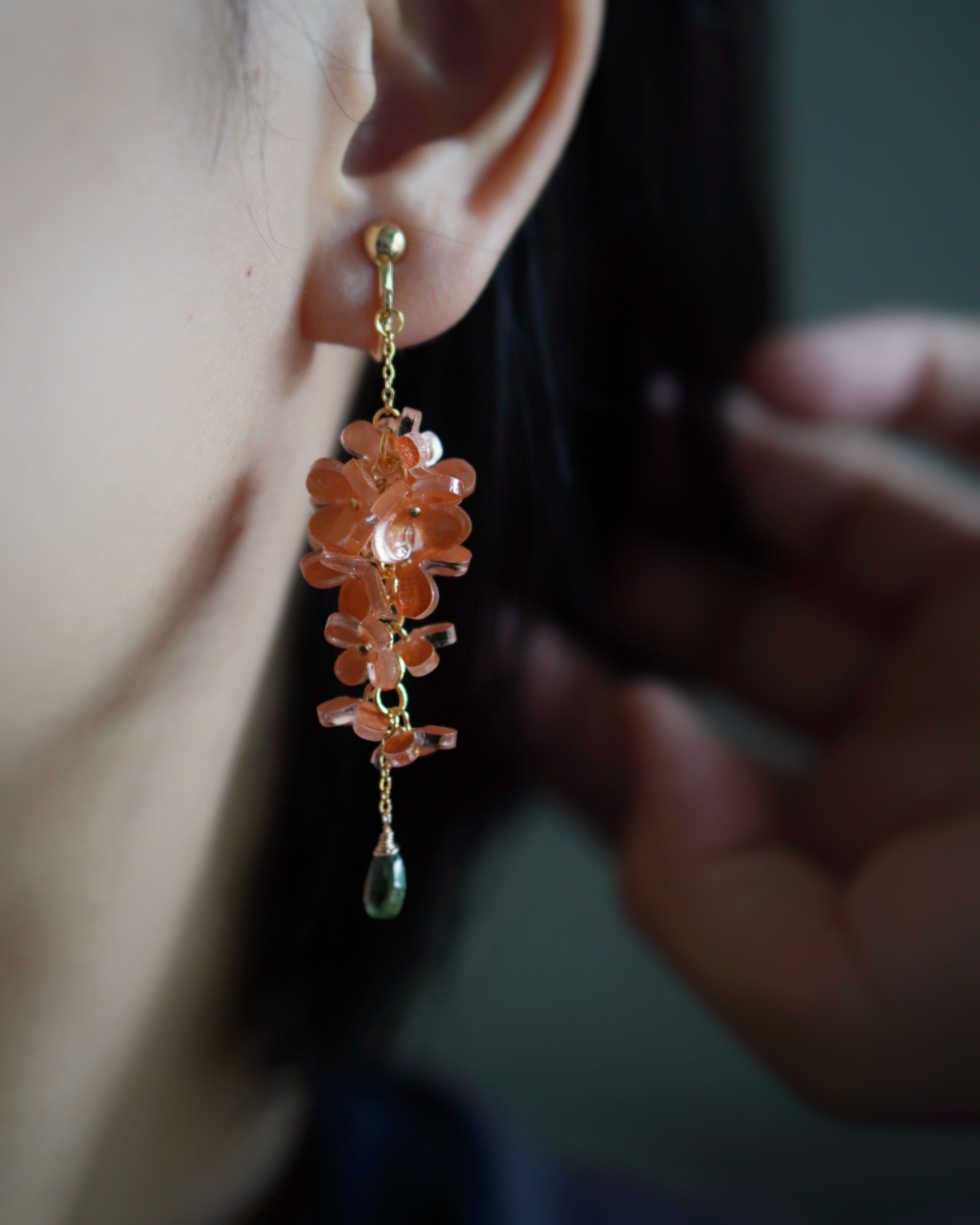 深みのある花の色合いと葉とこぼれる雫をイメージしたグリーンアパタイトの澄んだ緑が印象的な耳飾りです。