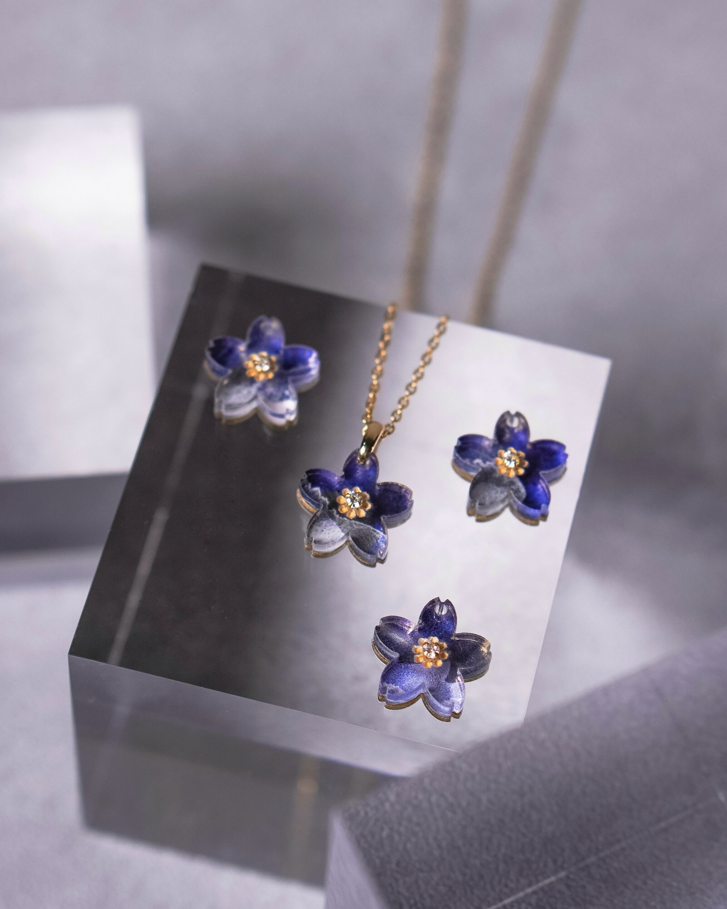 桜の凛とした強さと儚さを表現するために、花の中央には彫刻を施し、silver925素材の石座を用いたジルコニアを輝かせています。