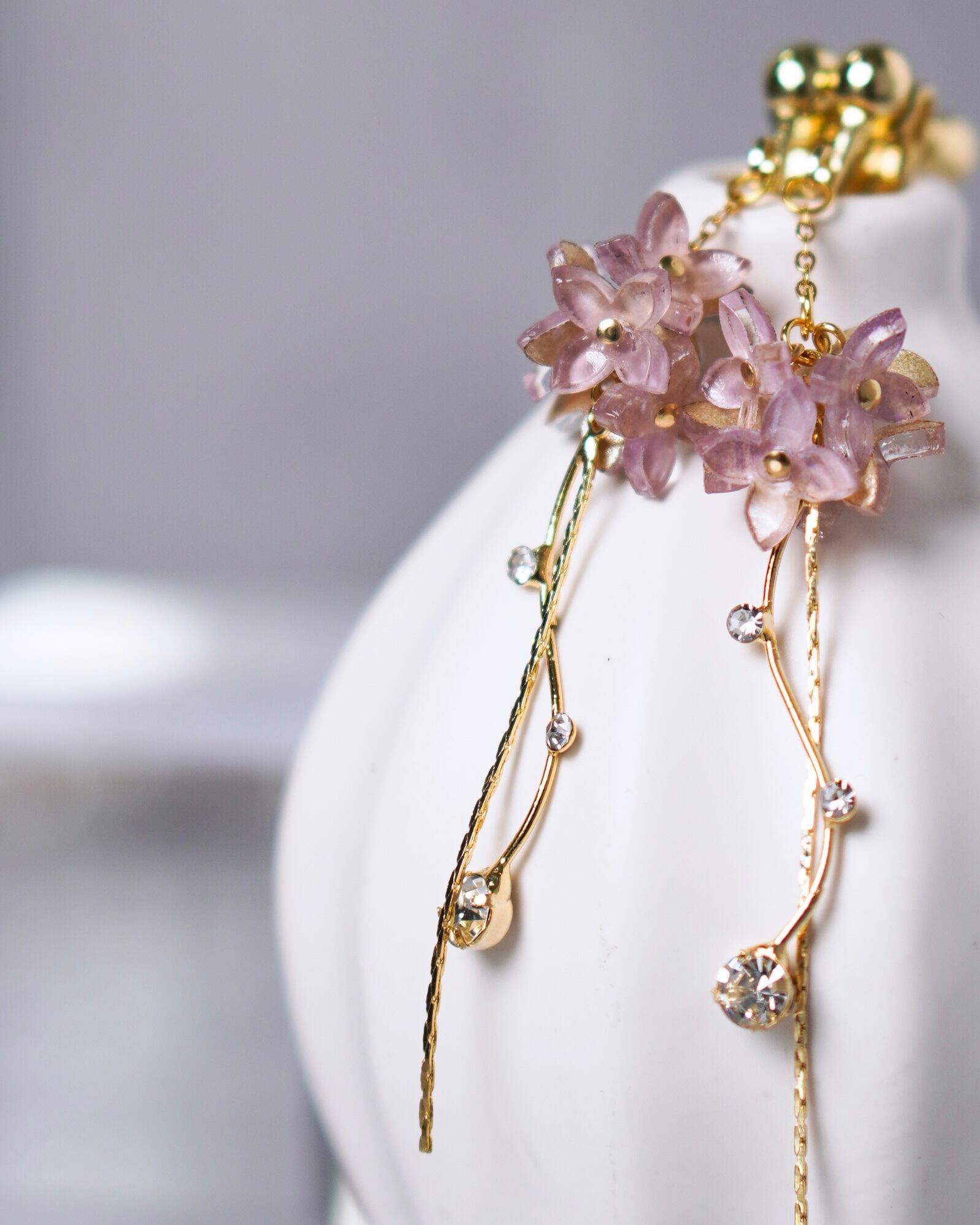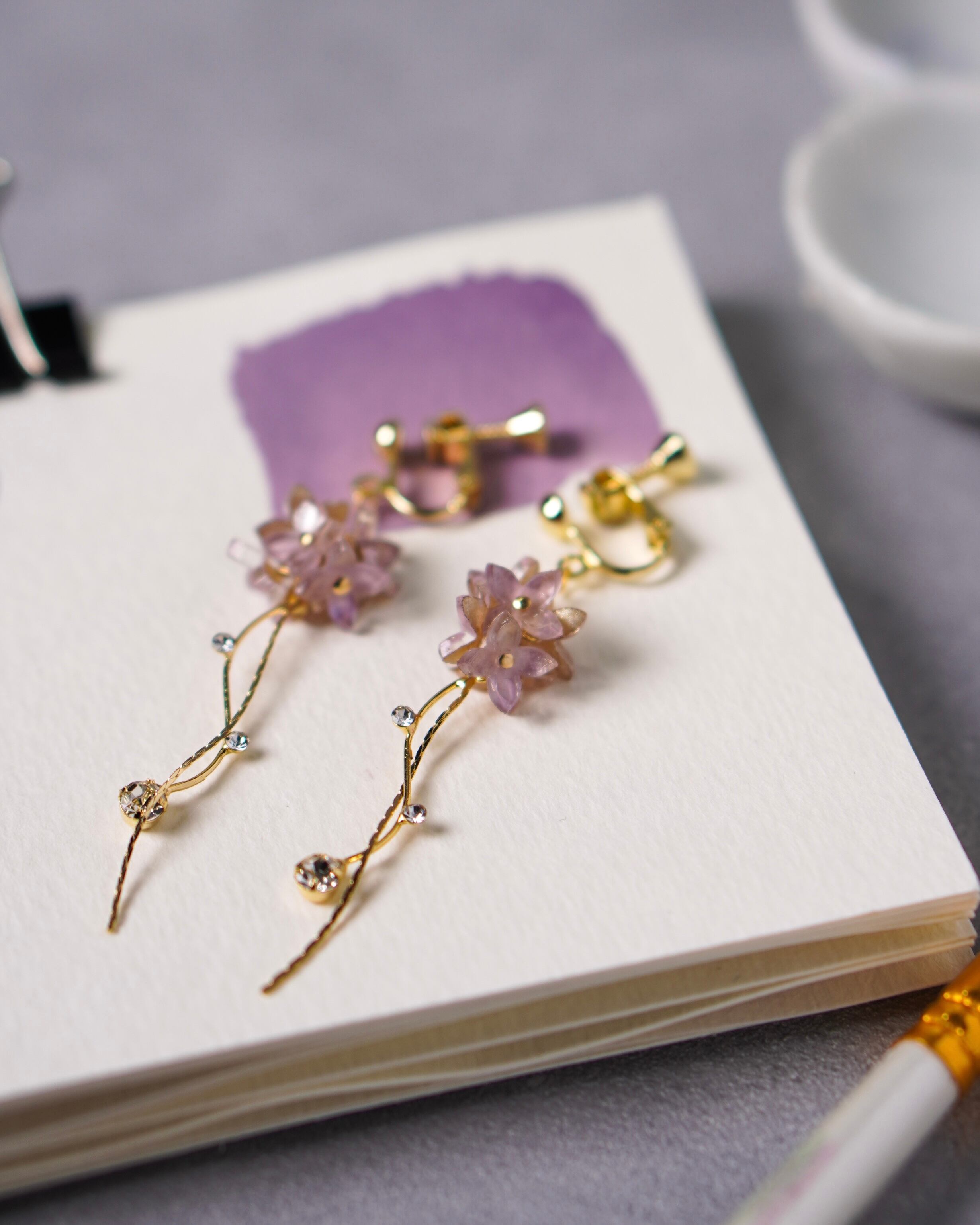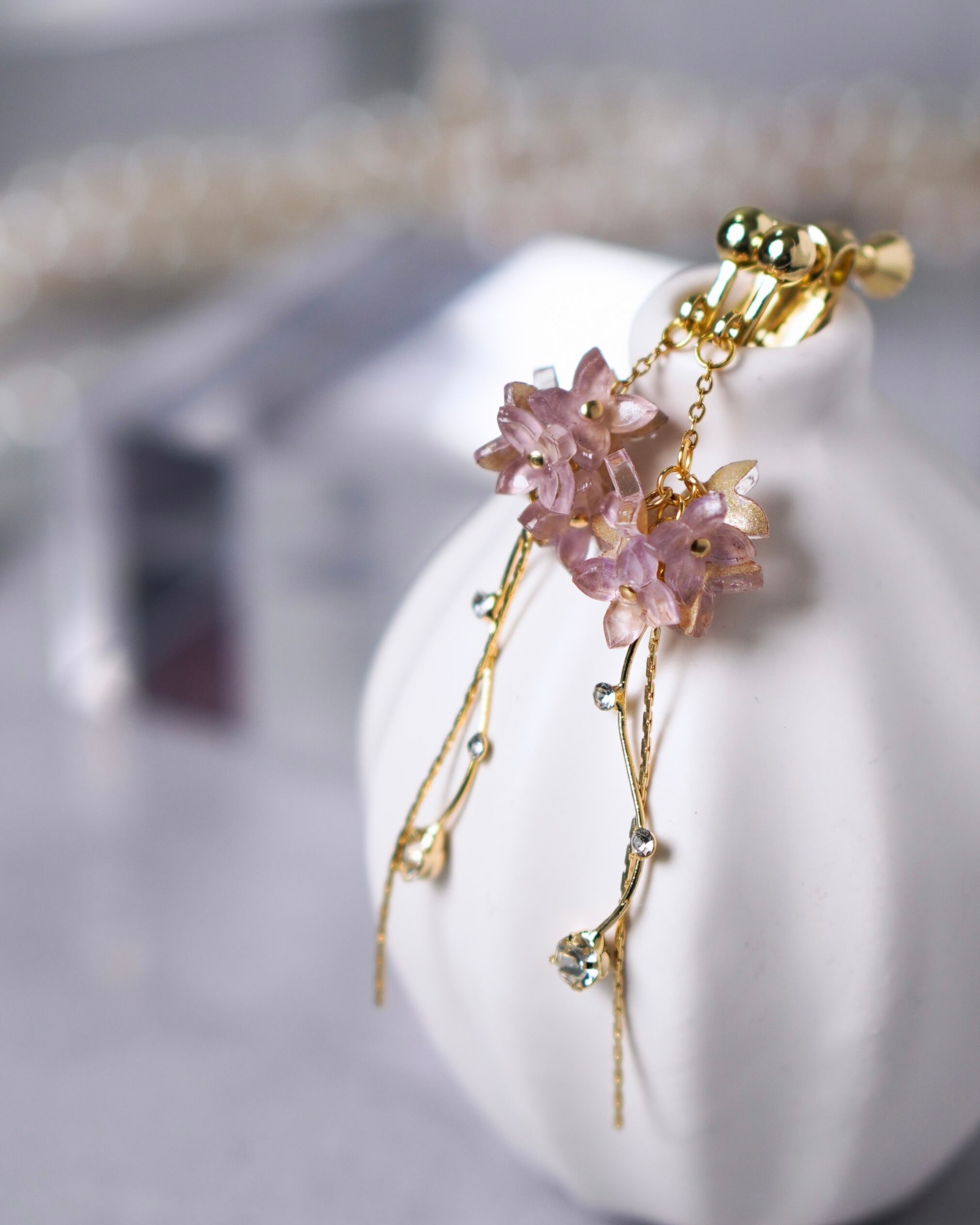 優しく淡い桃色がかった薄紫の花と葉とジルコニアの煌めきが印象的な耳飾りです。