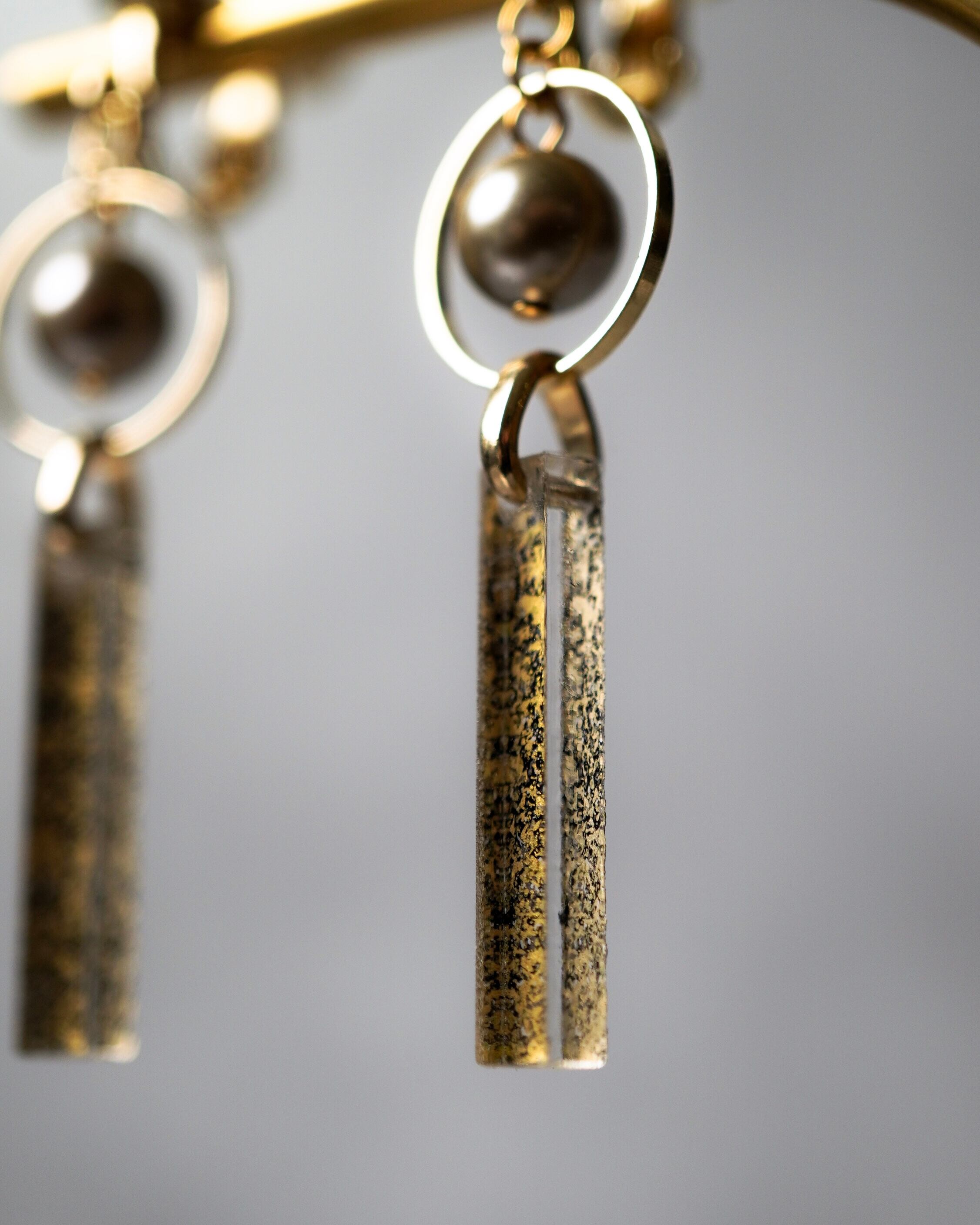雷のような、地割れのような、絵の具を飛び散らせて描いたアクリルの上にシャンパンゴールドカラーの貝パールが柔らかに光を反射します。
